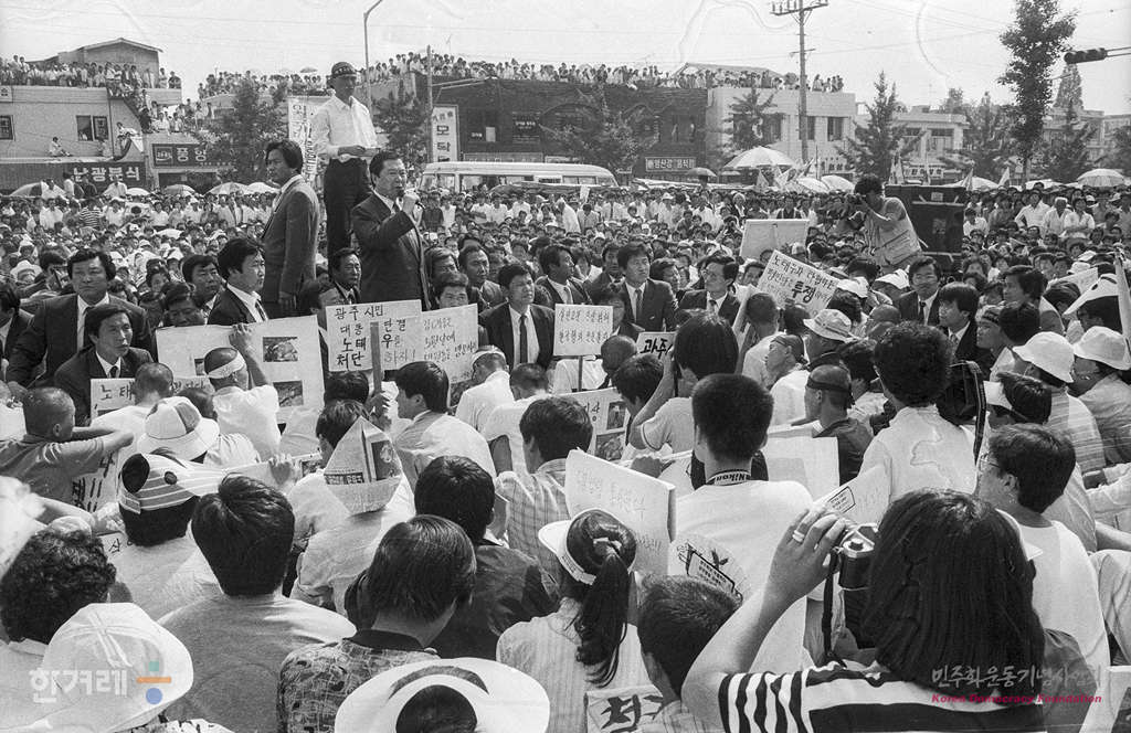 - 1989년 6월 3일 광주항쟁의 책임자 처리와 조선대생 이철규씨 사인규명을 요구하는 시위가 계속되는 광주지역에 4.26총선 이후 1년여만에 김대중 평민당 총재가 광주교대 교정에서 열린 시국강연에 남대협 소속 학생들이 김총재와 사전면담과 평민당 각성을 요구하는 시위를 벌이자 차에서 내려 직접 대회를 하고 있다