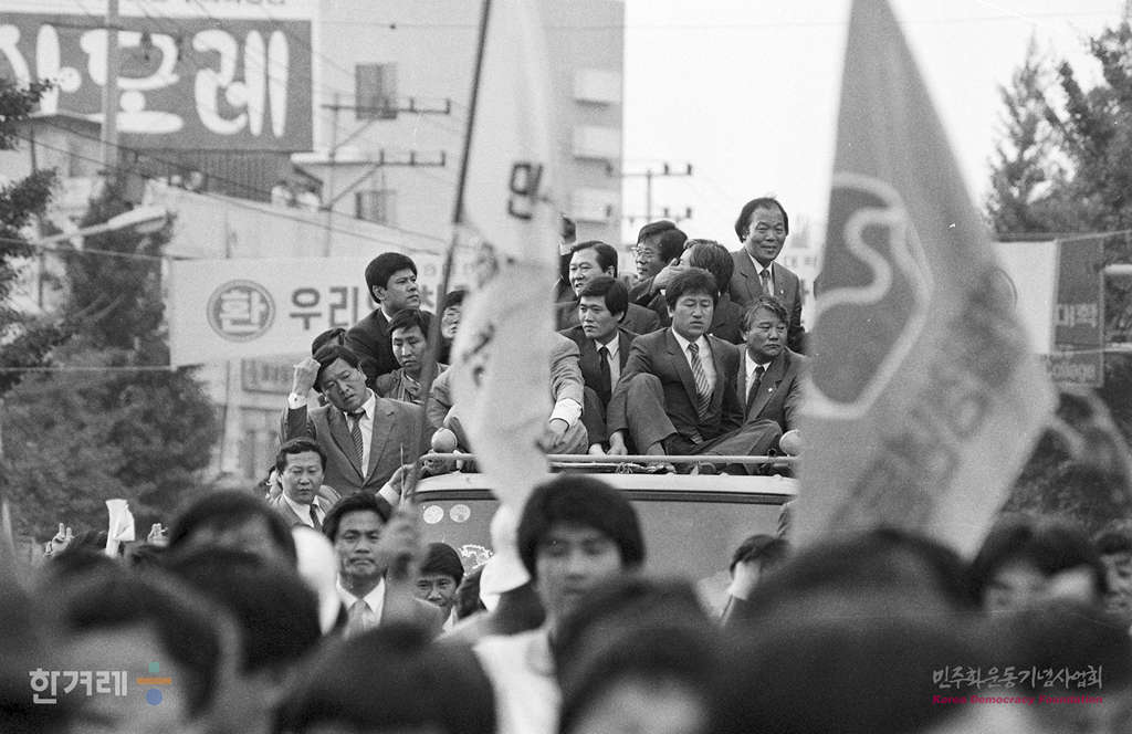 - 1989년 6월 3일 광주항쟁의 책임자 처리와 조선대생 이철규씨 사인규명을 요구하는 시위가 계속되는 광주지역에 4.26총선 이후 1년여만에 찾은 김대중 총재를 비롯한 평민당 지도부를 실은 버스가 많은 인파를 헤치고 광주교대로 들어서고 있다.