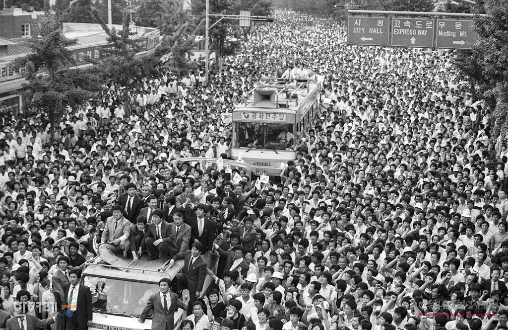 - 1989년 6월 3일 광주항쟁의 책임자 처리와 조선대생 이철규씨 사인규명을 요구하는 시위가 계속되는 광주지역에 4.26총선 이후 1년여만에 찾은 김대중 총재를 비롯한 평민당 지도부를 실은 버스가 많은 인파를 헤치고 광주교대로 들어서고 있다.