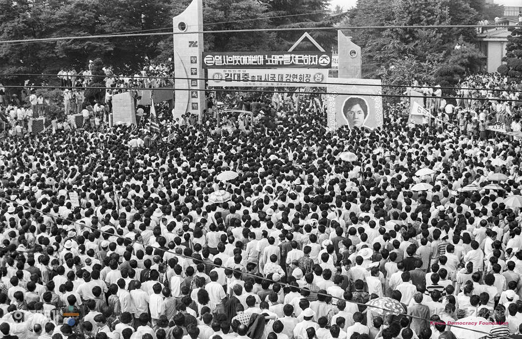- 1989년 6월 3일 광주항쟁의 책임자 처리와 조선대생 이철규씨 사인규명을 요구하는 시위가 계속되는 광주지역에 4.26총선 이후 1년여만에 찾은 김대중 총재를 비롯한 평민당 지도부를 실은 버스가 많은 인파를 헤치고 광주교대로 들어서고 있다.