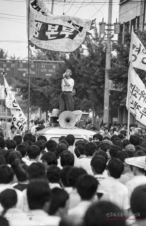- 1989년 6월 3일 광주항쟁의 책임자 처리와 조선대생 이철규씨 사인규명을 요구하는 시위가 계속되는 광주지역에 4.26총선 이후 1년여만에 김대중 평민당 총재가 광주교대 교정에서 열린 시국강연에 남대협 소속 학생들이 김총재와 사전면담과 평민당 각성을 요구하는 시위를 벌이고 있다.