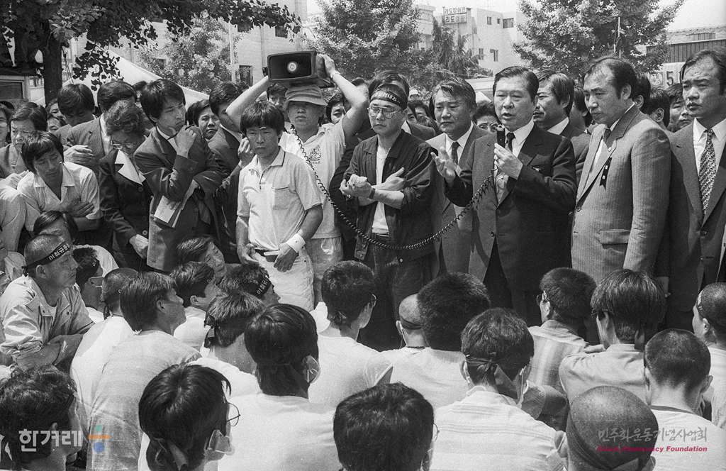 - 1989년 6월 3일 광주항쟁의 책임자 처리와 조선대생 이철규씨 사인규명을 요구하는 시위가 계속되는 광주지역에 4.26총선 이후 1년여만에 김대중 평민당 총재가 광주교대 교정에서 열린 시국강연에 남대협 소속 학생들이 김총재와 사전면담과 평민당 각성을 요구하는 시위를 벌이자 차에서 내려 직접 대회를 하고 있다