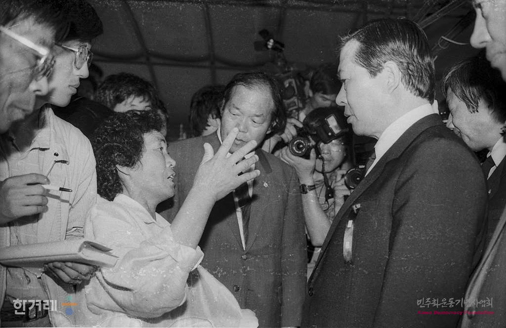 - 1989년 6월 3일 광주항쟁의 책임자 처리와 조선대생 이철규씨 사인규명을 요구하는 시위가 계속되는 광주지역에 4.26총선 이후 1년여만에 김대중 평민당 총재가 이씨가 안치 되어있는 조선대병원 분향소를 찾자 이씨의 어머니 황정자씨가 진상규명에 나서줄 것을 요구하는 호소를 하고 있다