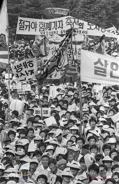 - 1989년 6월 3일 광주항쟁의 책임자 처리와 조선대생 이철규씨 사인규명을 요구하는 시위가 계속되는 광주지역에 4.26총선 이후 1년여만에 김대중 평민당 총재가 광주교대 교정에서 열린 시국강연에 남대협 소속 학생들이 김총재와 사전면담과 평민당 각성을 요구하는 시위를 벌이고 있다.