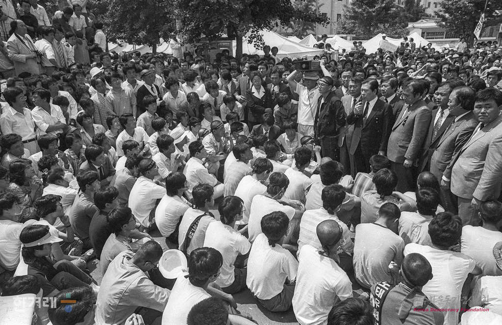 - 1989년 6월 3일 광주항쟁의 책임자 처리와 조선대생 이철규씨 사인규명을 요구하는 시위가 계속되는 광주지역에 4.26총선 이후 1년여만에 김대중 평민당 총재가 광주교대 교정에서 열린 시국강연에 남대협 소속 학생들이 김총재와 사전면담과 평민당 각성을 요구하는 시위를 벌이자 차에서 내려 직접 대회를 하고 있다