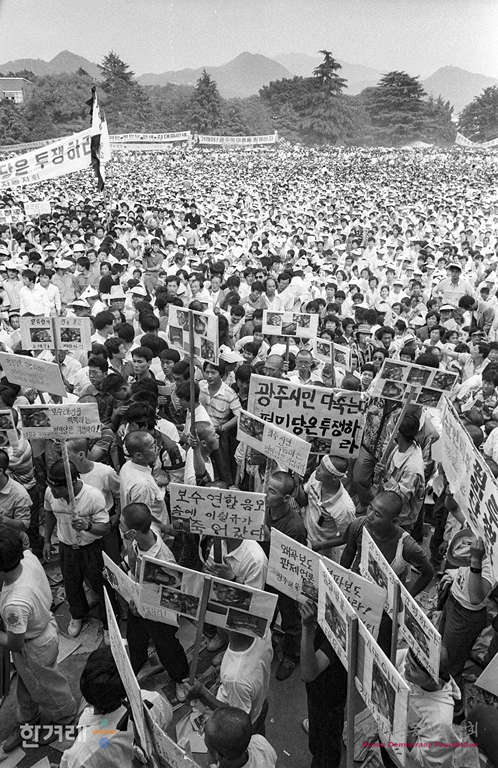 - 1989년 6월 3일 광주항쟁의 책임자 처리와 조선대생 이철규씨 사인규명을 요구하는 시위가 계속되는 광주지역에 4.26총선 이후 1년여만에 김대중 평민당 총재가 광주교대 교정에서 열린 시국강연에 남대협 소속 학생들이 김총재와 사전면담과 평민당 각성을 요구하는 시위를 벌이고 있다.