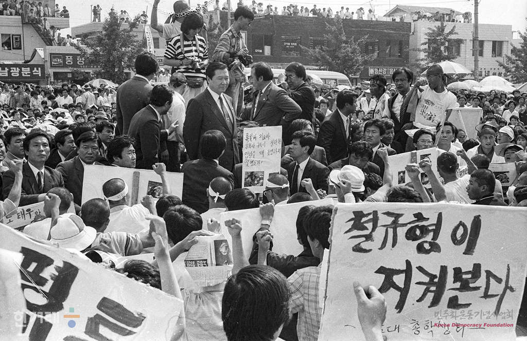 - 1989년 6월 3일 광주항쟁의 책임자 처리와 조선대생 이철규씨 사인규명을 요구하는 시위가 계속되는 광주지역에 4.26총선 이후 1년여만에 김대중 평민당 총재가 광주교대 교정에서 열린 시국강연에 남대협 소속 학생들이 김총재와 사전면담과 평민당 각성을 요구하는 시위를 벌이자 차에서 내려 직접 대회를 하고 있다