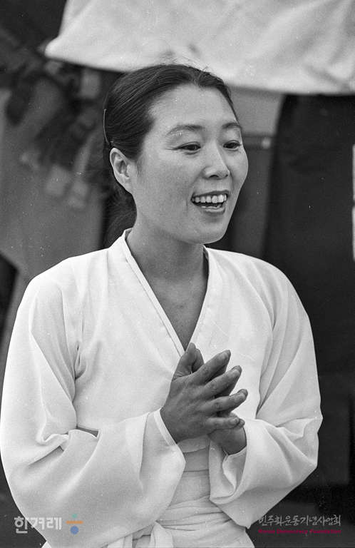 - 1989년 6월 2일 저녁 6시 30분 강혜숙 춤패의 통일춤 한마당이 서울 단국대학교 운동장 간이무대에서 펼쳐져 강씨를 비롯한 춤패들이 통일춤 하나딤을 위하여 춤공연을 하고 있다.
