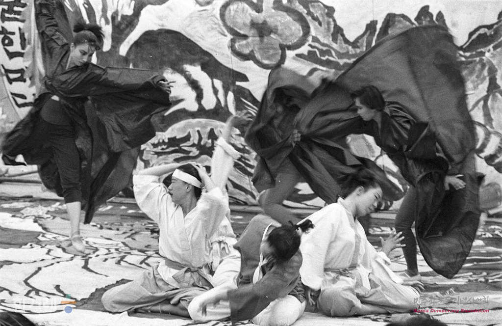 - 1989년 6월 2일 저녁 6시 30분 강혜숙 춤패의 통일춤 한마당이 서울 단국대학교 운동장 간이무대에서 펼쳐져 강씨를 비롯한 춤패들이 통일춤 하나딤을 위하여 춤공연을 하고 있다.
