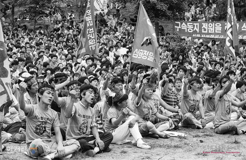- 1989년 6월 4일 서울지역 노동자 7백여명은 서울 서강대학교에서 열린 서울지역 노조협의회 창립 1주년 기념 및 구속노동자 석방 및 노동악법 개정 촉구대회 집회에 참석해 구속노동자 석방과 노동악법 철폐를 위해 전국노조협의회 건설에 박차를 가하겠다는 결의를 다지고 있다.
