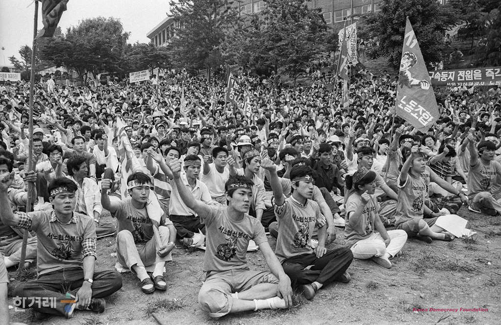 - 1989년 6월 4일 서울지역 노동자 7백여명은 서울 서강대학교에서 열린 서울지역 노조협의회 창립 1주년 기념 및 구속노동자 석방 및 노동악법 개정 촉구대회 집회에 참석해 구속노동자 석방과 노동악법 철폐를 위해 전국노조협의회 건설에 박차를 가하겠다는 결의를 다지고 있다.