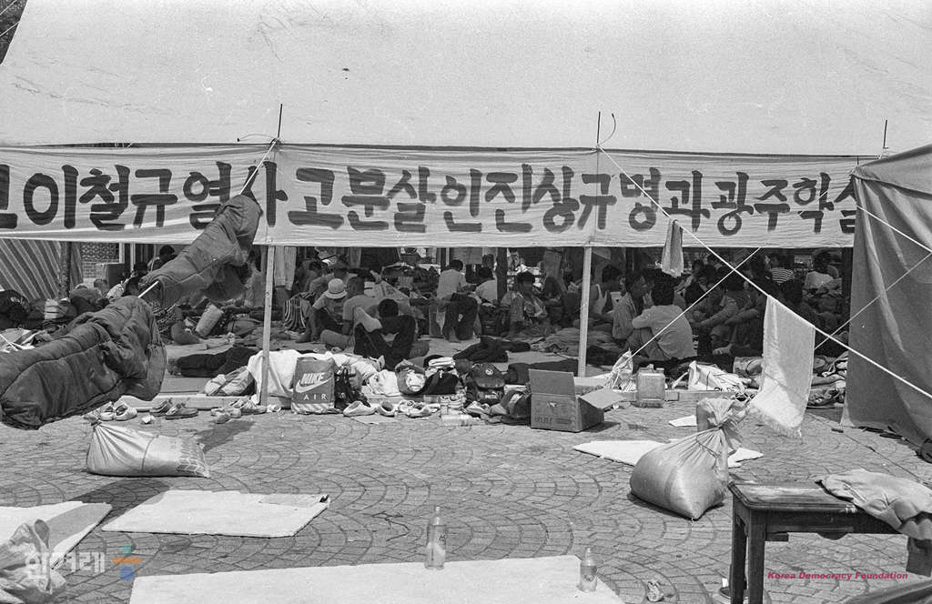 - 1989년 6월 3일 조선대생 이철규씨 사인규명 등을 요구하는 대학생들의 서울 명동성당 단식농성이 열흘째 계속되는 가운데 많은 학생들이 탈진한 채 누워있다.