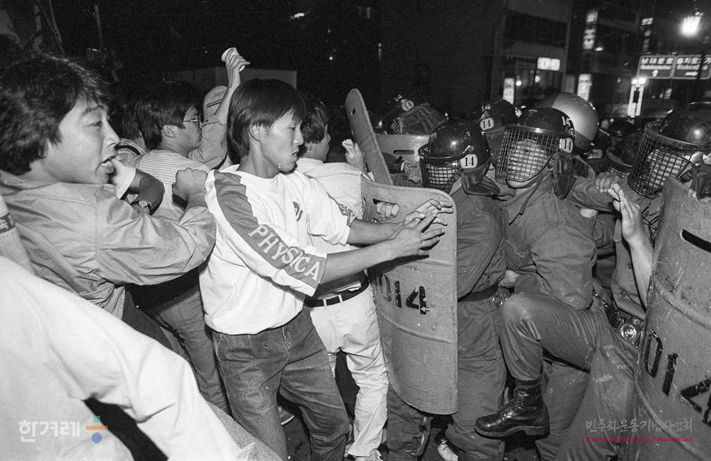 - 1989년 6월 3일 조선대생 이철규씨 사인규명 등을 요구하는 대학생들의 서울 명동성당 단식농성이 열흘째 계속되면서 많은 학생들이 탈진한 가운데 명동성당입구에서 지지집회를 마친 참가자들이 평화행진을 하려다 경찰과 몸싸움을 벌이고 있다.