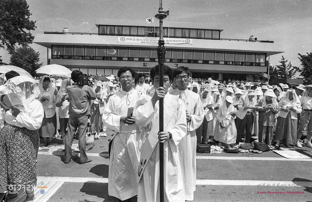 - 1989년 6월 6일 오후1시 천주교 정의구현 전국사제단은 신부1벽여명과 신도 3천여명이 참석한 가운데 경기도 파주 임진각 망배단앞 광장에서 민족의 화해와 나라의 평화를 위한 통일염원 미사를 드리고 있다.