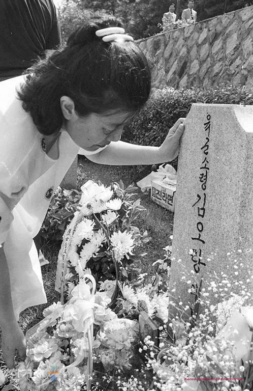 - 1989년 6월 6일 12.12사태때 당시 정병주 특전사령관의 보좌관으로 있다가 총격을 받고 숨진 고 김오랑 소령의 미망인 백영옥( 당시 충격으로 장님이 됨)씨가 부산에서 올라와 남편의 묘비를 어루만지며 한을 달래고 있다.