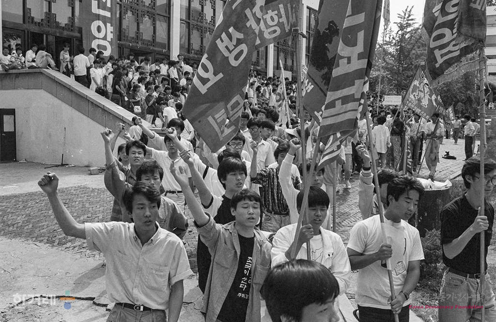 - 1989년 6월 6일 서울지역 동부지구 총학생회 연합 소속 학생들이 서울 세종대학교에서 광주학살 및 이철규학형 고문살인 주범 노태우정권 퇴진 집회을 마친 뒤 학교 정문앞에서 구호를 외치고 있다.