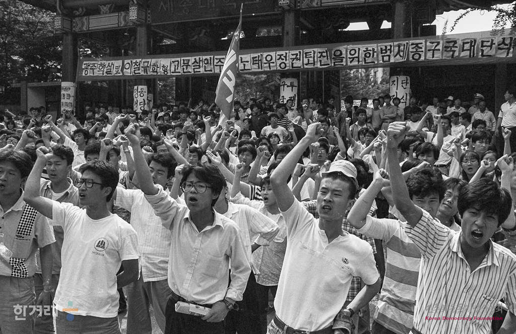 - 1989년 6월 6일 서울지역 동부지구 총학생회 연합 소속 학생들이 서울 세종대학교에서 광주학살 및 이철규학형 고문살인 주범 노태우정권 퇴진 집회을 마친 뒤 학교 정문앞에서 구호를 외치고 있다.