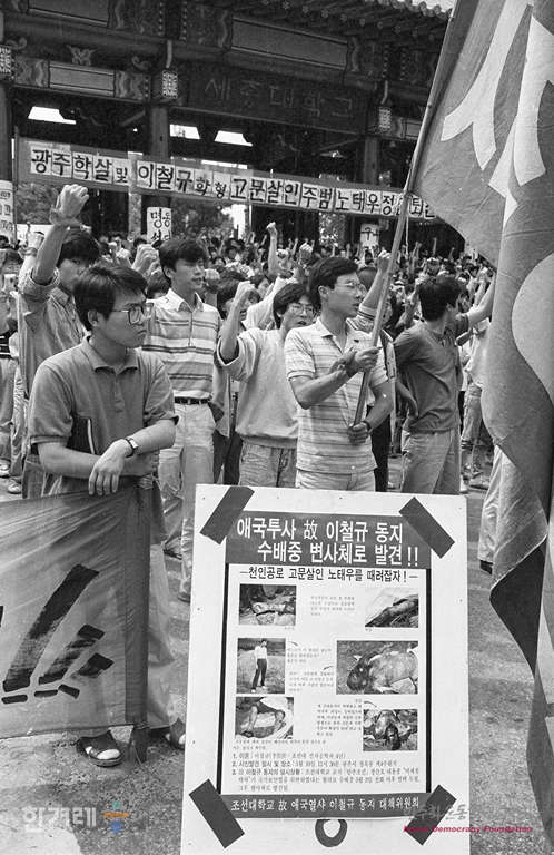 - 1989년 6월 6일 서울지역 동부지구 총학생회 연합 소속 학생들이 서울 세종대학교에서 광주학살 및 이철규학형 고문살인 주범 노태우정권 퇴진 집회을 마친 뒤 학교 정문앞에서 구호를 외치고 있다.