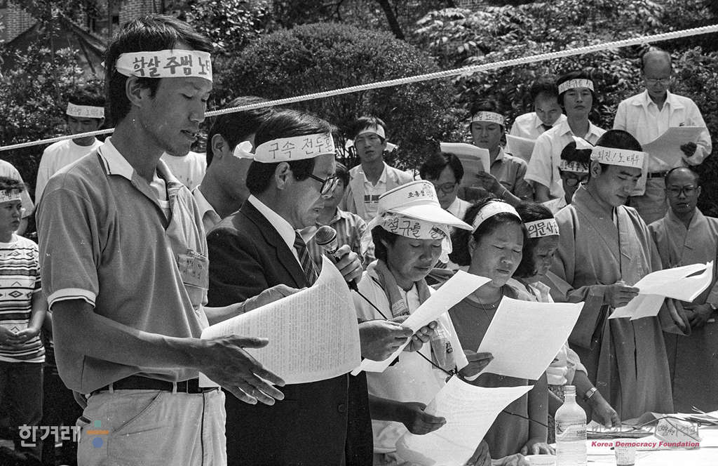 - 1989년 6월 7일 오후2시 제정구 진보정치연합 대표 오충일 전민련 의장 이범영 전청협의장 등 가계인사 1백여명은 서울 중구 명동성당에서 기자회견을 갖고 민주실천 국민선언을 발표하고 있다. 이들은 선언문에서 이철규씨 사인 진상규명과 광주학살 5공비리주범 전두환씨의 텔레비전 생중계 공개중언 및 정호용 박준병씨의 공직박탈과 구속처벌, 광주학살과 관련한 미국의 공식사과, 국가보안법 노동악법 교육악법 등의 철폐와 8백여명의 양심수 즉각석방과 전국교직원노조 인정 물가폭등 부동산 투기 등으로부터 서민생계를 보호하기 위한 근본대책 수립 등 민주화 6개항을 제시했다.