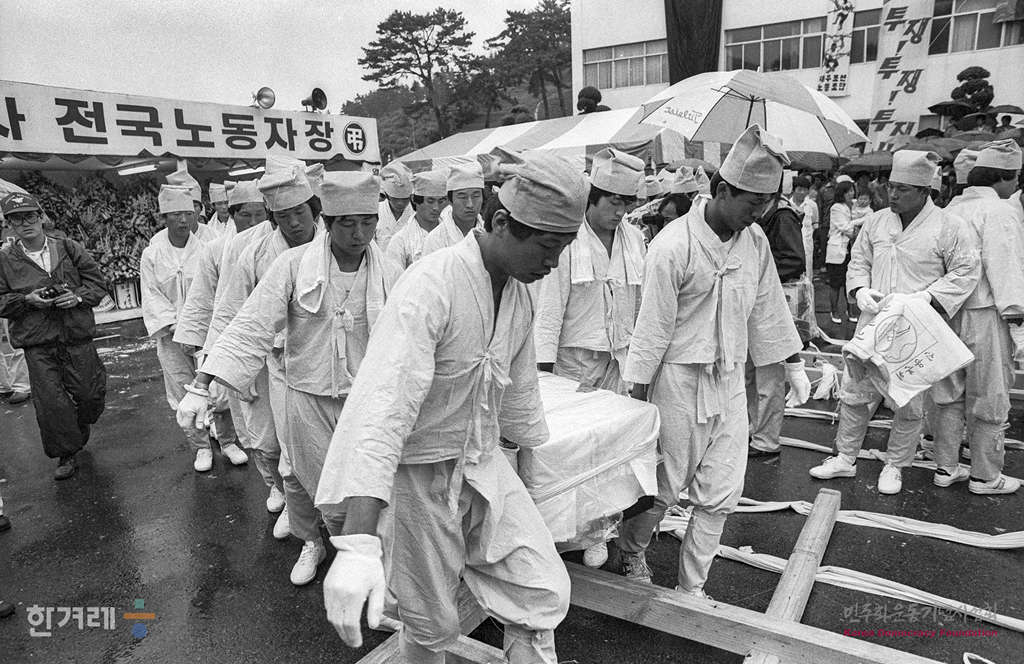 - 1989년 6월 8일 대우조선 분신노동자 고 이상모, 박진석씨의 합동장례식이 비가 내리는 가운데 옥포조선소 운동장에서 열려 노동자 시민 등 3천여명이 참석한 가운데 전국 노동자장으로 열리고 있다.