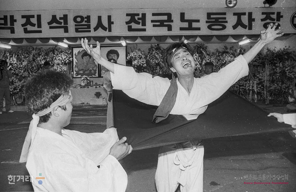 - 1989년 6월 8일 대우조선 분신노동자 고 이상모, 박진석씨의 합동장례식이 비가 내리는 가운데 옥포조선소 운동장에서 열려 노동자 시민 등 3천여명이 참석한 가운데 전국 노동자장으로 열리고 있다.