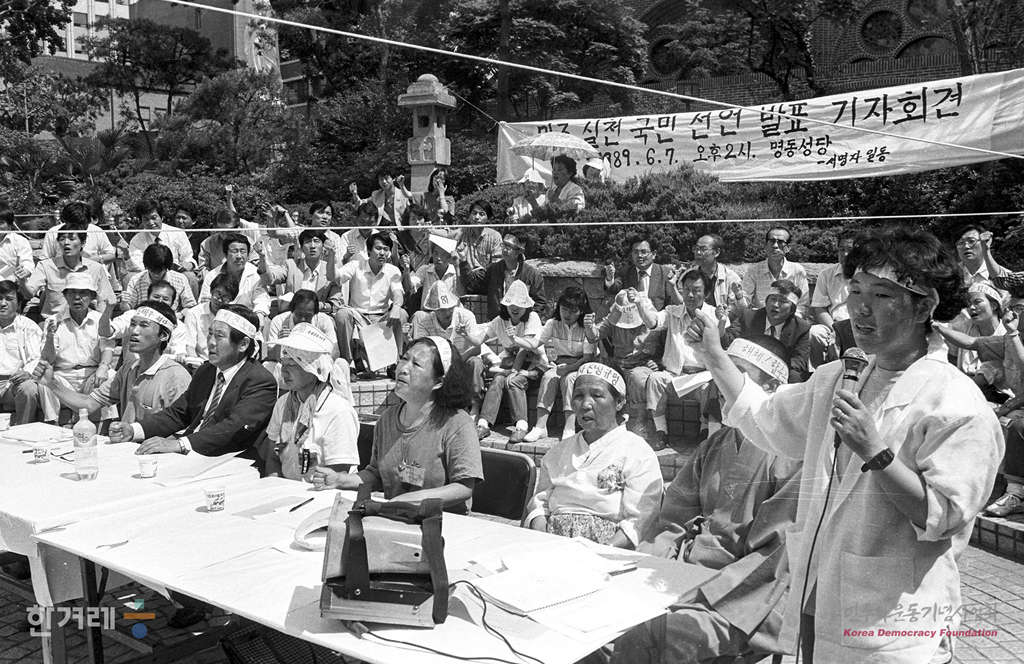 - 1989년 6월 7일 오후2시 제정구 진보정치연합 대표 오충일 전민련 의장 이범영 전청협의장 등 가계인사 1백여명은 서울 중구 명동성당에서 기자회견을 갖고 민주실천 국민선언을 발표하고 있다. 이들은 선언문에서 이철규씨 사인 진상규명과 광주학살 5공비리주범 전두환ㅆ의 텔레비전 생중계 공개중언 및 정호용 박준병씨의 공직박탈과 구속처벌, 광주학살과 관련한 미국의 공식사과, 국가보안법 노동악법 교육악법 등의 철폐와 8백여명의 양심수 즉각석방과 전국교직원노조 인정 물가폭등 부동산 투기 등으로부터 서민생계를 보호하기 위한 근본대책 수립 등 민주화 6개항을 제시했다.