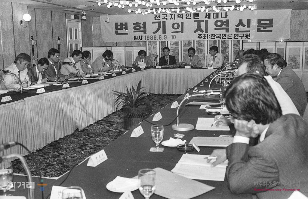 - 1989년 6월 9일 한국언론연구원이 서울 올림피아호텔에서 변혁기의 지역신문을 주제로 연 전국지역언론 세미나에 언론학자와 신문관계자들이 참석해 열띤 토론을 펼치고 있다.