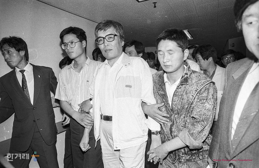 - 1989년 6월 9일 전국교직원노조 결성과 관련 사전구속영장이 발부된 윤영규 전교조 위원장을 비롯한 교사 5명이 사복경찰에 이끌려 입원해 있던 서울 영동세브란스병원에서 연행되고 있다.
