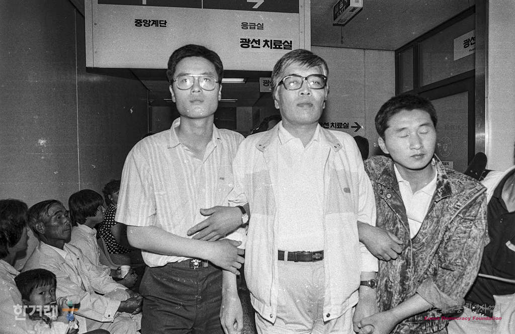 - 1989년 6월 9일 전국교직원노조 결성과 관련 사전구속영장이 발부된 윤영규 전교조 위원장을 비롯한 교사 5명이 사복경찰에 이끌려 입원해 있던 서울 영동세브란스병원에서 연행되고 있다.