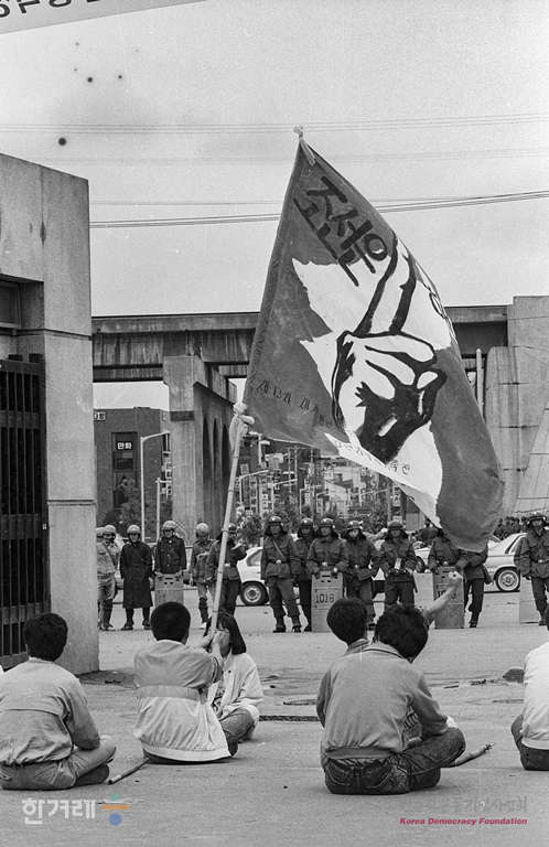 - 1989년 6월 9일 6월항쟁을 앞두고 전대협주최로 명동성당 구국단식투쟁 계승 및 6.10회담 성사 결의대회 등 3일간 행사를 가질 예정이었던 연세대는 경찰이 집회신고가 되지 않았다는 이유로 학교주변에 40개 중대 6천여명을 배치해 교문 출입을 막고 검문검색을 벌이자 학교내에 있던 학생들이 경찰과 대치를 하고 있다