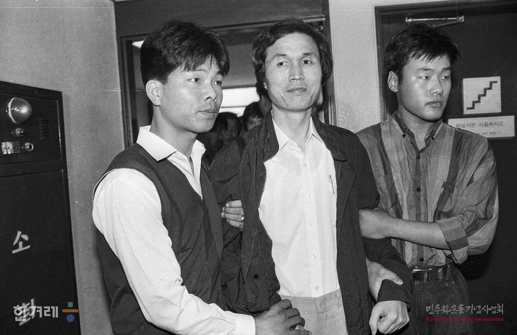 - 1989년 6월 9일 전국교직원노조 결성과 관련 사전구속영장이 발부된 윤영규 전교조 위원장을 비롯한 교사 5명이 사복경찰에 이끌려 입원해 있던 서울 영동세브란스병원에서 연행되고 있다.