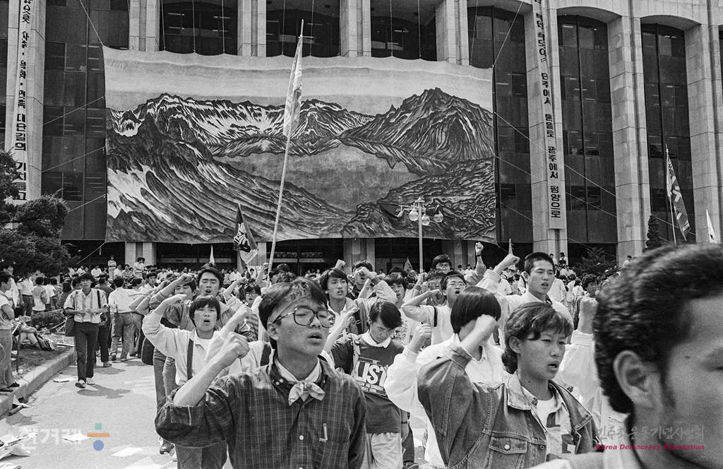 - 1989년 6월 10일 6월민주항쟁 2돌을 맞아 전대협 소속 대학생들과 시민 2천여명이 참석한 가운데 서울 연세대 민주광장에서 6.10남북실무회담 방행 규탄 및 평양축전 참가를 위한 백만학도 결의대회를 하고 있다.