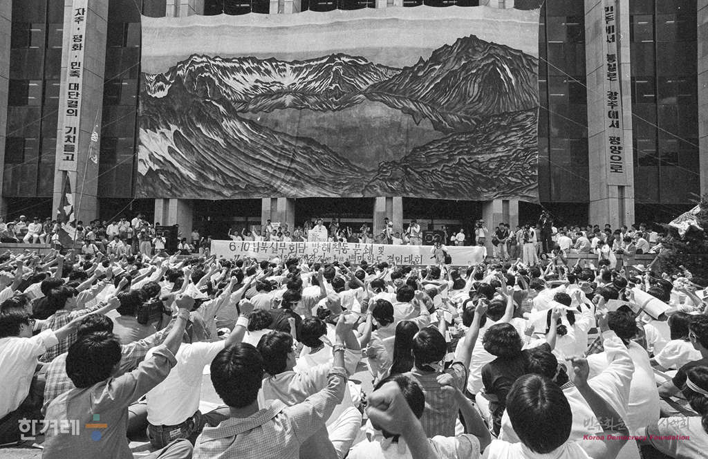 - 1989년 6월 10일 6월민주항쟁 2돌을 맞아 전대협 소속 대학생들과 시민 2천여명이 참석한 가운데 서울 연세대 민주광장에서 6.10남북실무회담 방행 규탄 및 평양축전 참가를 위한 백만학도 결의대회를 하고 있다.