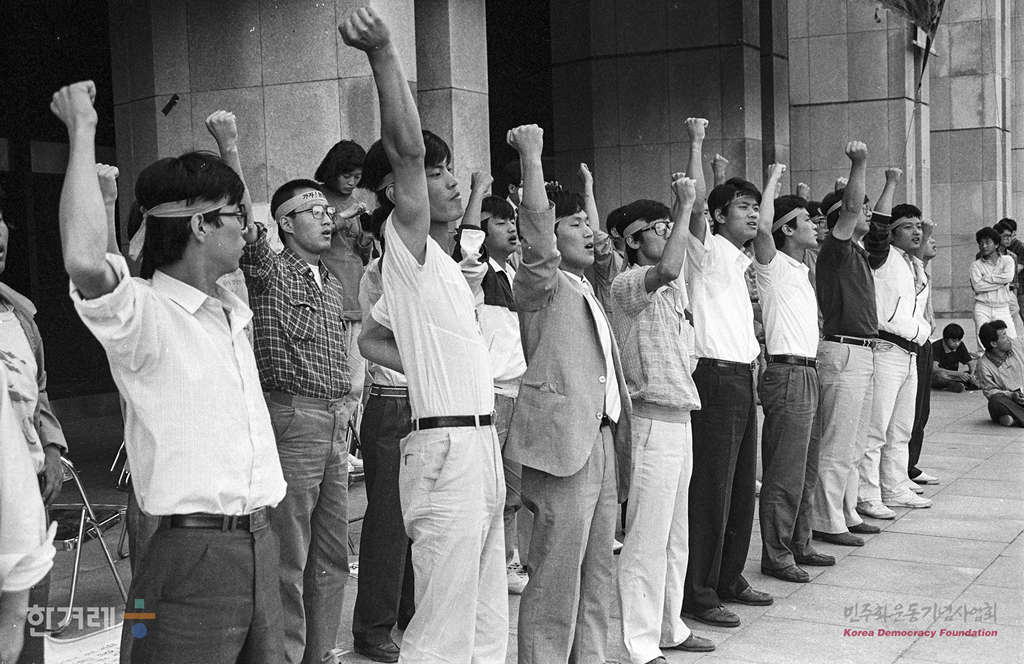 - 1989년 6월 10일 6월민주항쟁 2돌을 맞아 전대협 소속 대학생들과 시민 2천여명이 참석한 가운데 서울 연세대 민주광장에서 6.10남북실무회담 방행 규탄 및 평양축전 참가를 위한 백만학도 결의대회를 하고 있다.