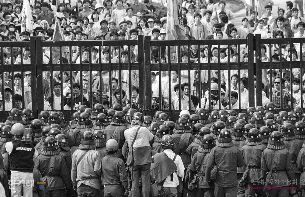 - 1989년 6월 10일 6월민주항쟁 2돌을 맞아 전대협 소속 대학생들과 시민 2천여명이 참석한 가운데 서울 연세대 민주광장에서 6.10남북실무회담 방행 규탄 및 평양축전 참가를 위한 백만학도 결의대회를 열고 있는 가운데 교뮨앞에서 경찰의 진압을 대비해 학생들과 대치를 하고 있다.