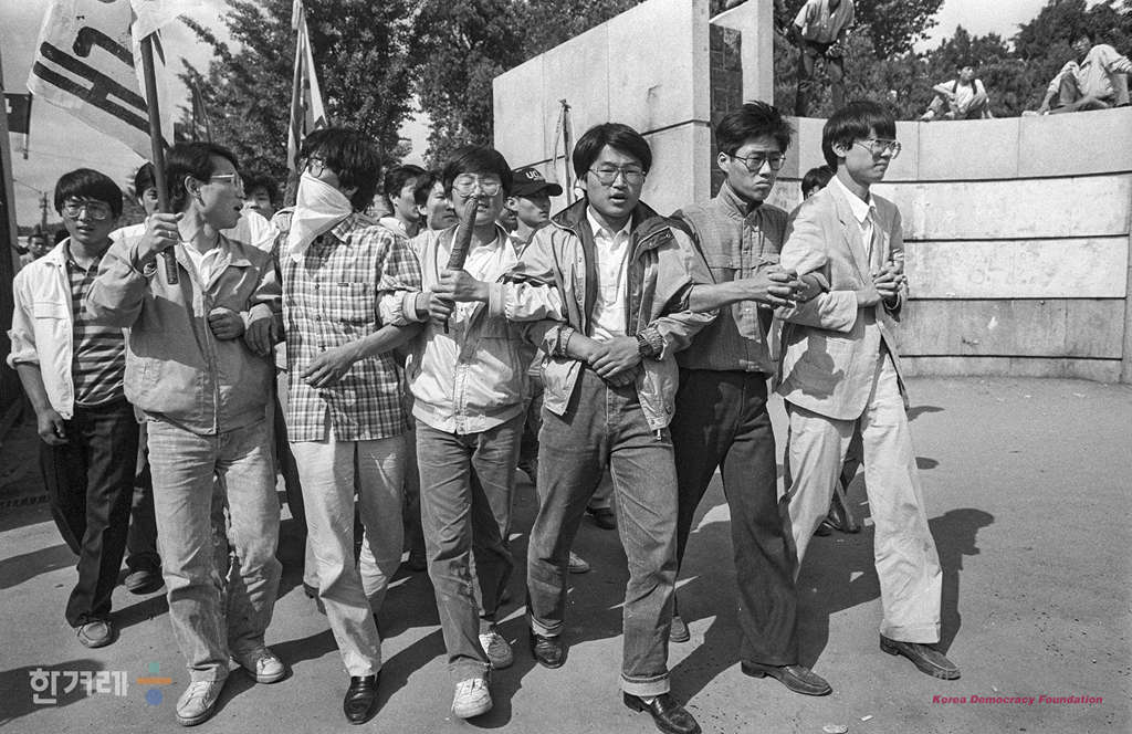 - 1989년 6월 10일 6월민주항쟁 2돌을 맞아 전대협 소속 대학생들과 시민 2천여명이 참석한 가운데 서울 연세대 민주광장에서 6.10남북실무회담 방행 규탄 및 평양축전 참가를 위한 백만학도 결의대회를 열고 있는 가운데 교뮨앞에서 경찰의 진압을 대비해 학생들과 대치를 하고 있다.