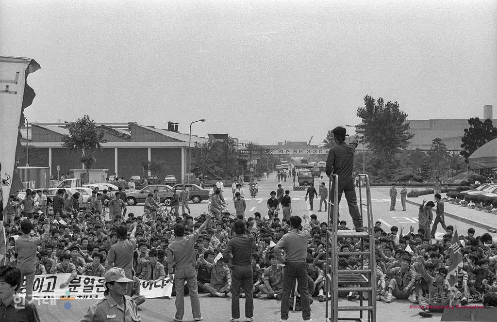 - 1989년 6월 12일 인천시 대우자동차 노조가 회사쪽이 제시한 최종임금인상안 수용여부를 놓고 찬반투표 강행에 조합원들의 반발을 하며 사내에서 집회를 하고 있다.