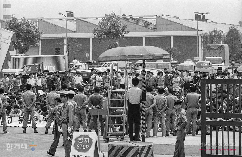 - 1989년 6월 12일 인천시 대우자동차 노조가 회사쪽이 제시한 최종임금인상안 수용여부를 놓고 찬반투표 강행에 조합원들의 반발을 하며 사내에서 집회를 하고 있다.