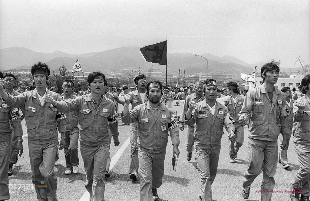 - 1989년 6월 12일 오전 9시 거제 대우조선 노동조합 조원원 3천여명이 조합원 총회를 하기 위해 회사내 민주광장으로 행진을 하고 있다.