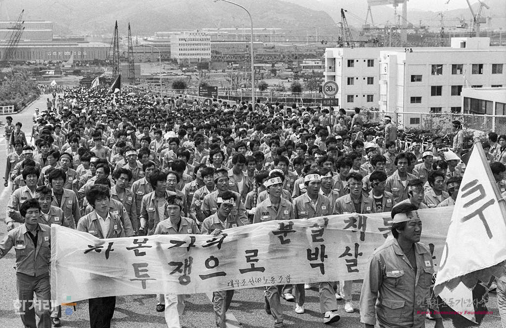- 1989년 6월 12일 오전 9시 거제 대우조선 노동조합 조원원 3천여명이 조합원 총회를 하기 위해 회사내 민주광장으로 행진을 하고 있다.