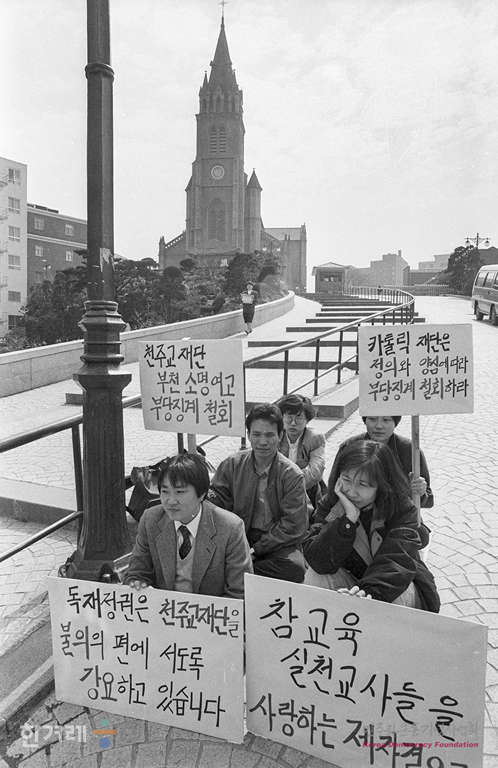 - 1990년 3월 22일 부천 소명여고 해직교사들이 서울 명동성당 입구에서 부당징계 철회를 요구하며 연좌농성을 벌이고 있다.