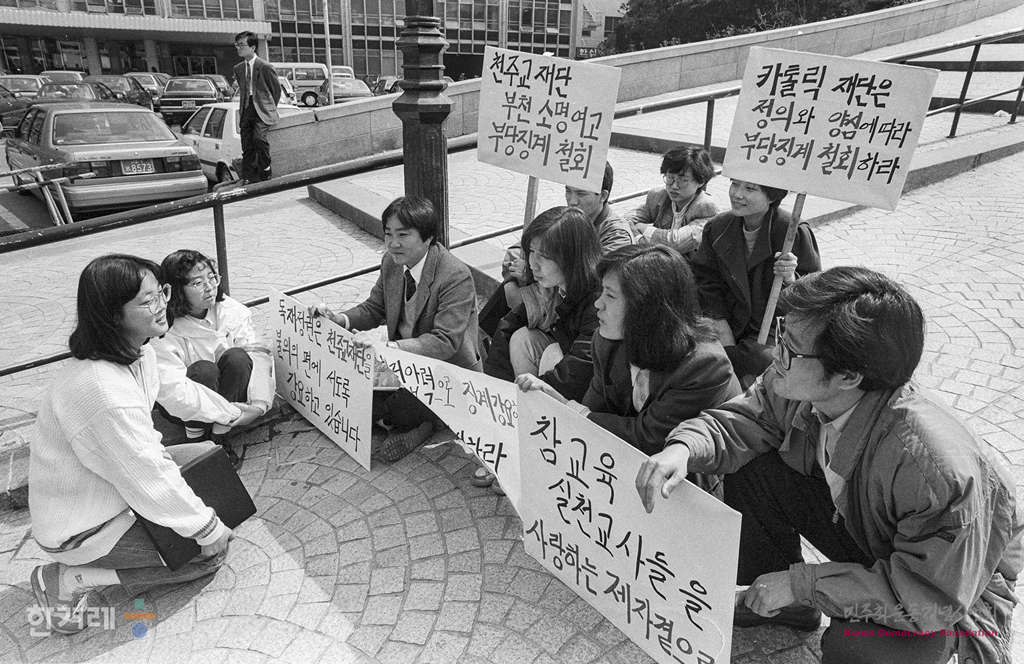 - 1990년 3월 22일 부천 소명여고 해직교사들이 서울 명동성당 입구에서 부당징계 철회를 요구하며 연좌농성을 벌이고 있다.