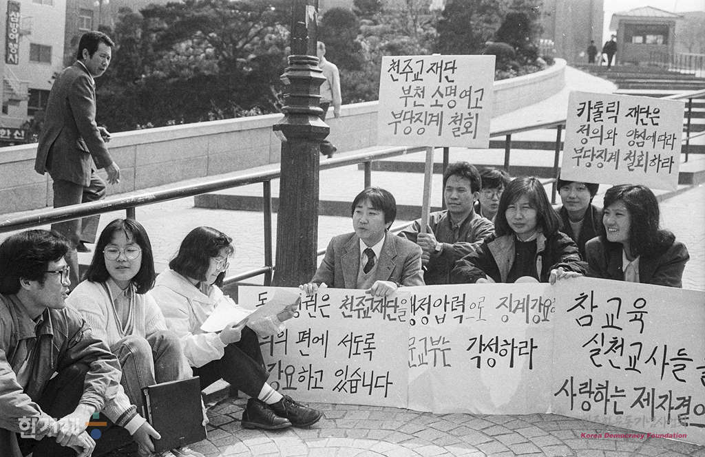 - 1990년 3월 22일 부천 소명여고 해직교사들이 서울 명동성당 입구에서 부당징계 철회를 요구하며 연좌농성을 벌이고 있다.