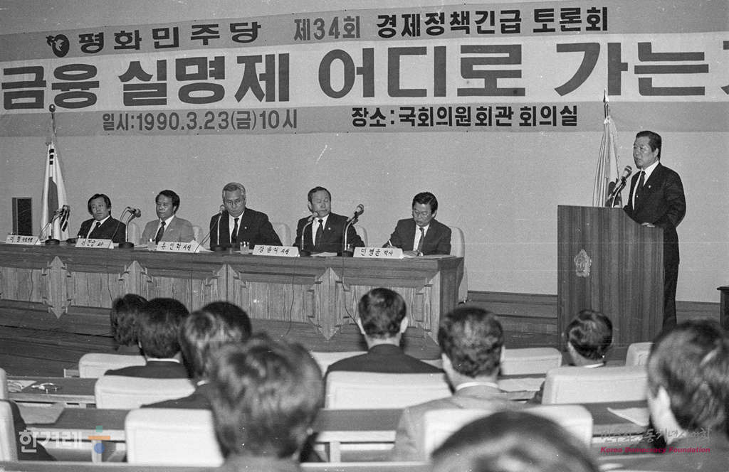 - 1990년 3월 23일 평민당은 국회의원 회관에서 금융실명제 어디로 가는가라는 주제로 경제정책 토론회를 하고 있다.