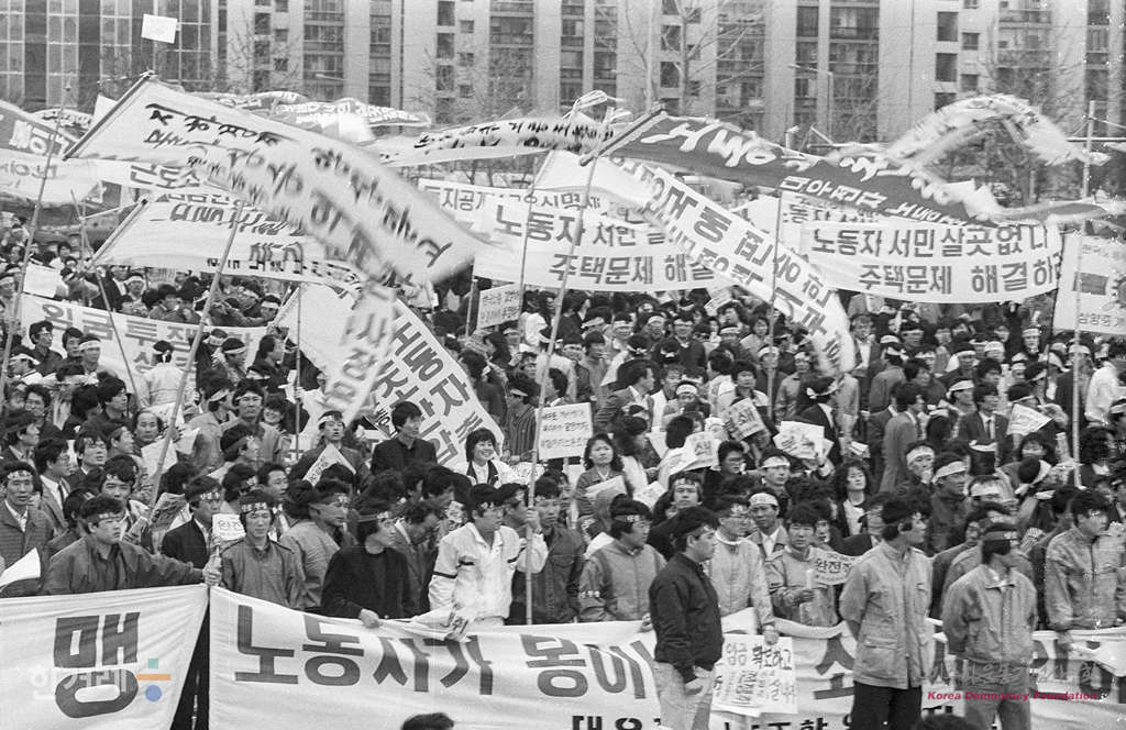 - 1990년 3월 24일 오후3시 한국노동조합총연맹은 서울 여의도광장에서 노총간부 및 노동자 5천여명이 참서간 가운데 노동운동탄압 및 90임투승리를 위한 결의대회를 갖고 조속한 경제민주화 시행을 정부당국에 촉구하고 있다.