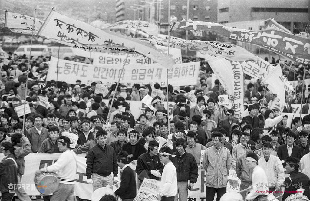 - 1990년 3월 24일 오후3시 한국노동조합총연맹은 서울 여의도광장에서 노총간부 및 노동자 5천여명이 참서간 가운데 노동운동탄압 및 90임투승리를 위한 결의대회를 갖고 조속한 경제민주화 시행을 정부당국에 촉구하고 있다.