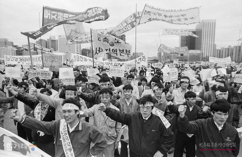- 1990년 3월 24일 오후3시 한국노동조합총연맹은 서울 여의도광장에서 노총간부 및 노동자 5천여명이 참서간 가운데 노동운동탄압 및 90임투승리를 위한 결의대회를 갖고 조속한 경제민주화 시행을 정부당국에 촉구하고 있다.