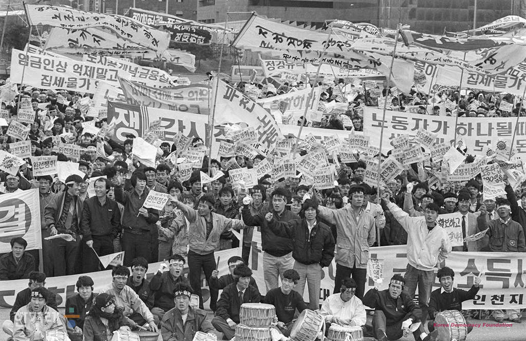 - 1990년 3월 24일 오후3시 한국노동조합총연맹은 서울 여의도광장에서 노총간부 및 노동자 5천여명이 참서간 가운데 노동운동탄압 및 90임투승리를 위한 결의대회를 갖고 조속한 경제민주화 시행을 정부당국에 촉구하고 있다.