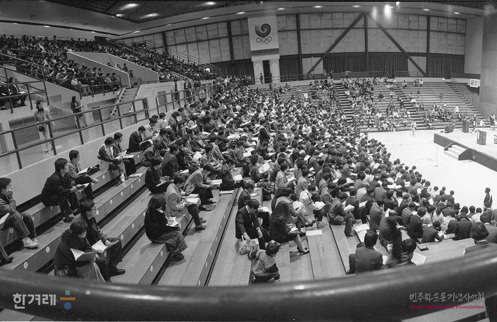 - 1990년 3월 24일 오후2시 국민주로 시작된 한겨레신문사 제2기 정기주주총회가 서울 올림픽공원에 있는 역도경기장에서 3천여명의 주주가 참석한 가운데 주주총회를 하고 있다.