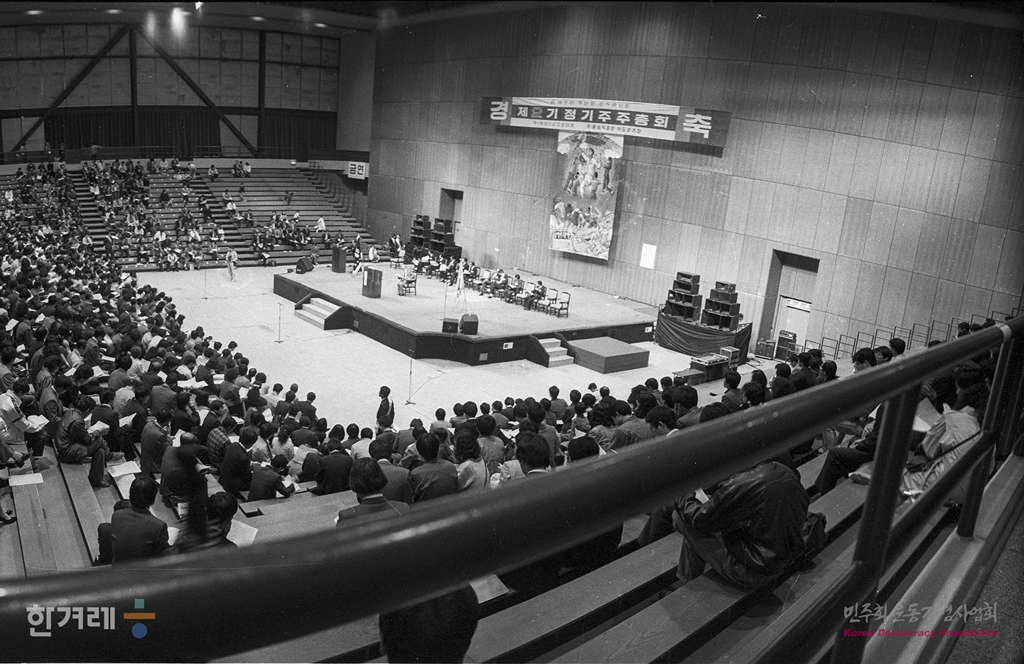 - 1990년 3월 24일 오후2시 국민주로 시작된 한겨레신문사 제2기 정기주주총회가 서울 올림픽공원에 있는 역도경기장에서 3천여명의 주주가 참석한 가운데 주주총회를 하고 있다.